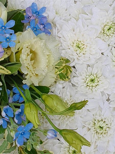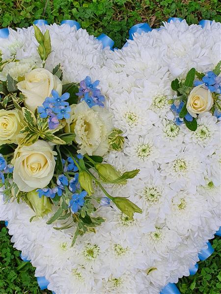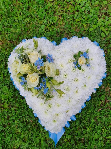 Pretty pastel heart with a pale blue ribbon edge,white base and pale blue and white rose spray.