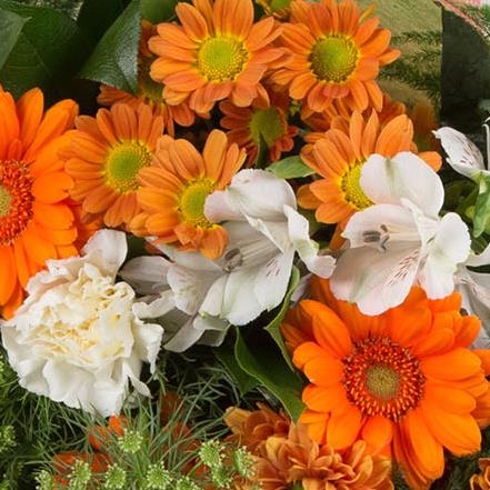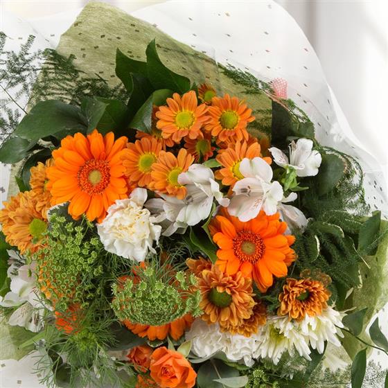 A simple hand-tied bunch of white and orange blooms including gerberas, chrysanthemums, carnations and alstromeria.This is NOT delivered in water